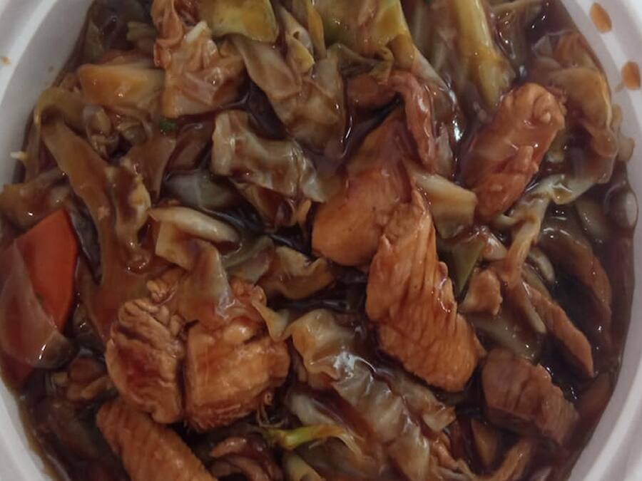 Macarrão oriental, legumes, carne e frango.
